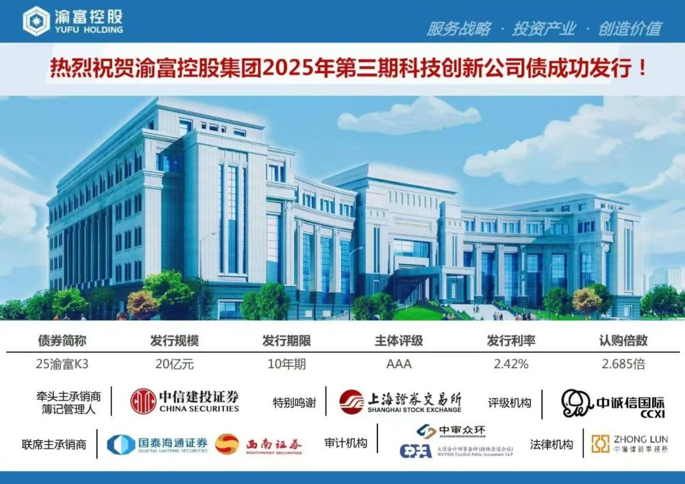 新闻动态 2025年 11月 3日 渝富控股集团成功发行2025年第三期科技创新公司债券 2025年10月28日,渝富控股集团成功发行2025年第三期科技创新公司债券,发行规模20亿元,发行利率2.42%,期限10年,募集资金可直接用于股权投资和基金出资。 本次低成本长期债券发行,充分体现了市场投资人对重庆科创产业的支持和对重庆渝富控股集团未来发展的坚定信心和高度认可。下一步,重庆渝富控股集团将进一步拓宽融资渠道、丰富融资产品,切实为服务重庆“33618”先进制造业体系注入更多金融血液。