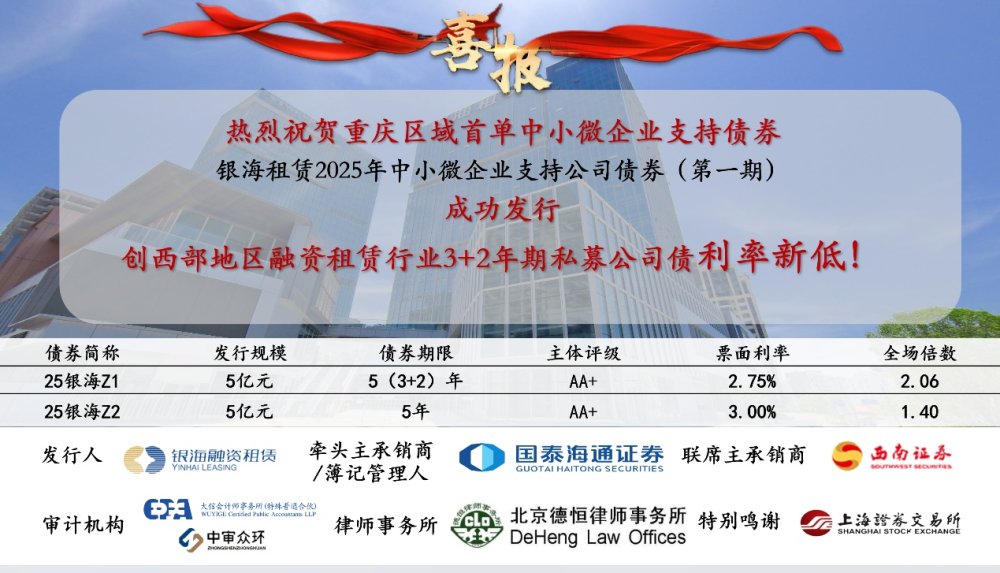 本次债券3+2年期品种以2.75%的票面利率创西部地区融资租赁行业同期限私募公司债利率新低;此外,银海租赁首次发行5年期公司债,票面利率为3%,本次债券发行引发资本市场热烈响应。作为重庆区域首家发行该类债券的融资租赁企业,银海租赁此次“破冰”之举填补了区域行业空白,树立了金融服务实体经济标杆。