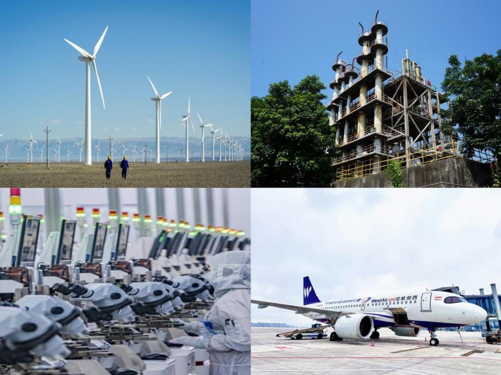 (左上:新疆哈密风力发电机迎风旋舞 ;右上:紫光国际化工设备矗立翠色中;左下:万国半导体顶起国产芯“脊梁”;右下:重庆银海租赁001号正在等待旅客登机)